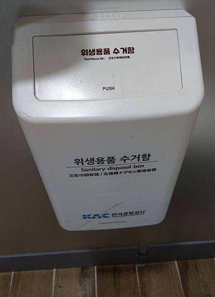 위생용품은 전용 수거함에 버려주세요.(請將用過的衛生用品扔進專用回收箱裡) 위생[衛生] 용품[用品] 전용 [專用] 수거함[收去函](廢紙、垃圾)回收桶